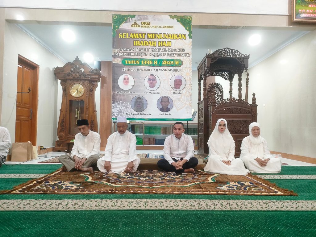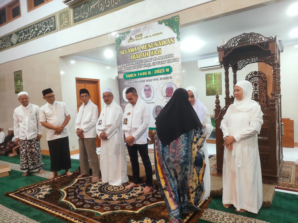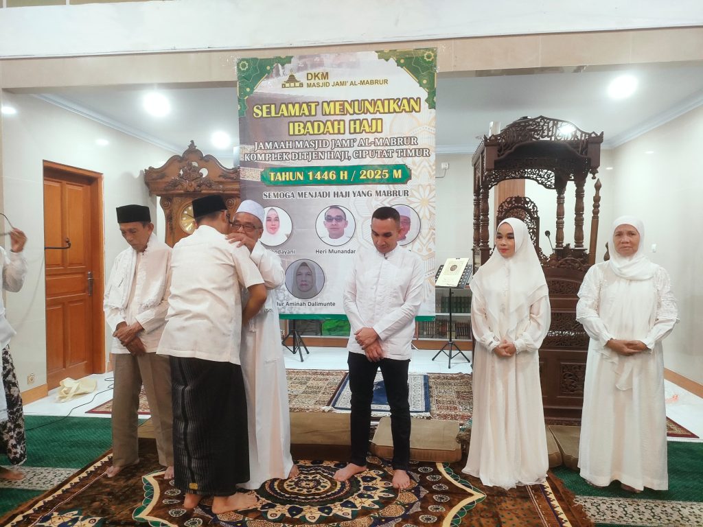 Komplek Ditjen Haji, Tangerang Selatan – Masjid Jami’ Al-Mabrur menggelar acara pelepasan jamaah haji pada Selasa malam (6/5) yang berlangsung khidmat dan penuh haru. Acara tersebut dipimpin oleh Sekretaris DKM, Ustadz Solikhul Umam, sebagai pembawa acara.